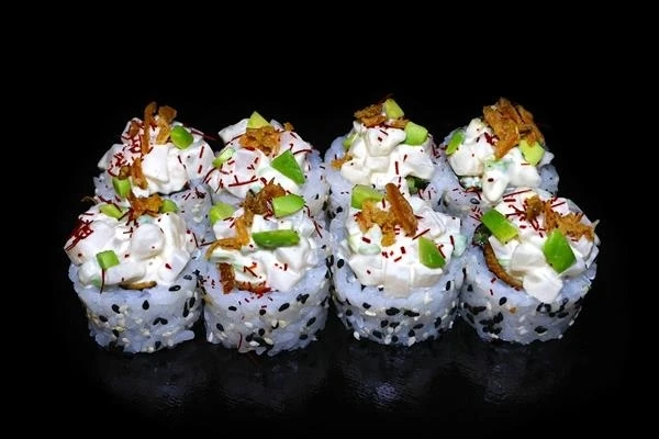 Холодный ролл. 8 кусочков. Состав:рис,нори,креветка темпура,сливочный сыр,свежий огурец,авокадо,гребешок,тобика,кунжут,карамелизированный лук. * Добавьте к вашему заказу имбирь,васаби,соевый соус.(Эти позиции добавляються вами по желанию и идут за отдельную стоимость)