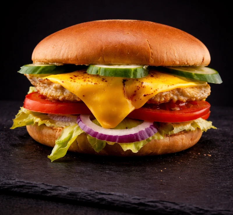 Состав:Булочка,соус цезарь,айсберг,помидор,свежий огурец,котлета куриная,сыр чедер,лук.