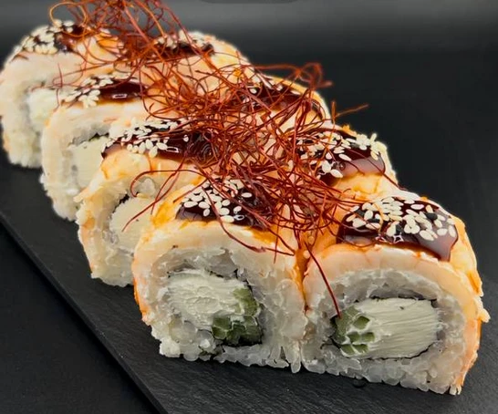 Холодный ролл. 8 кусочков. Состав:рис,сливочный сыр,свежий огурец,икра тобико,креветка,соус унаги,кунжут.