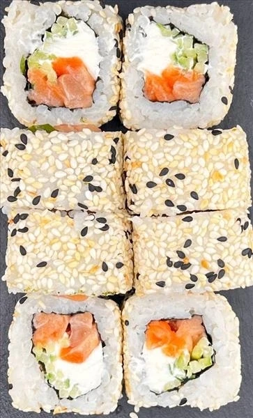 Классический холодный ролл. 8 кусочков. Состав: Рис,нори,лосось,сливочный сыр,свежий огурец,кунжут.