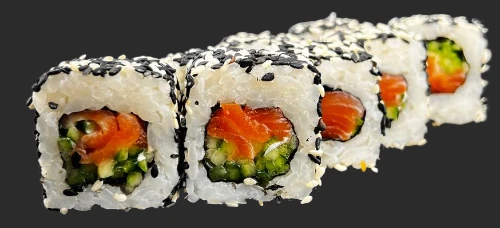 Холодный ролл. 8 тшт. Состав: рис,нори,лосось,свежий огурец,кунжут.