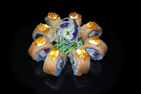 Холодный ролл . 8 кусочков. Состав:рис,нори,сливочный сыр,тунец,авокадо,лосось,красная игра. * Добавьте к вашему заказу имбирь,васаби,соевый соус.(Эти позиции добавляються вами по желанию и идут за отдельную стоимость)