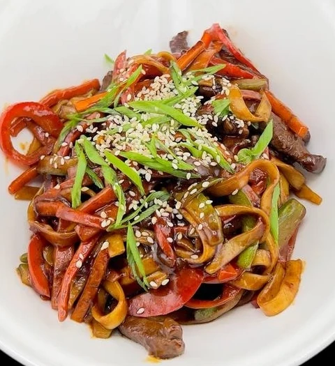 Состав:говядина;лапша удон;морковь;перец болгарский;кабачок;лук репчатый;соус устричный;соус унаги;соевый соус;сладкий чили;лук зеленый;кунжут