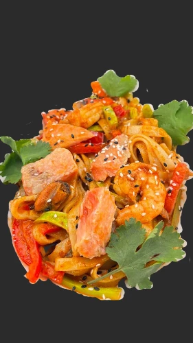 Состав:креветки;мидии,лосось,кальмар,лапша удон;перец болгарский;кабачок;грибы;соус устричный;соус том ям;соевый соус;кинза,лайм;кунжут