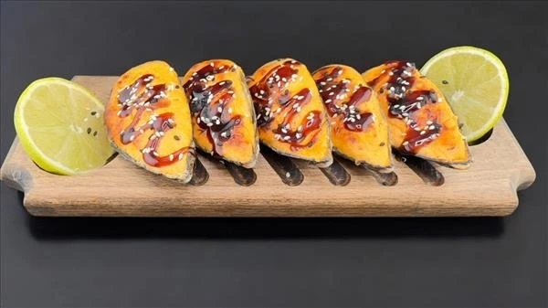 5 штук. Состав: мидии в створках , рис, соус спайси, соус унаги, кунжут.