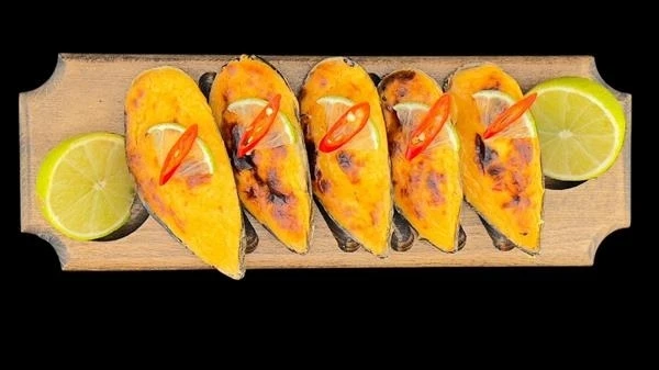 Состав:Мидии в открытой створке 5 штук;сыр творожный;соус масаго;паста томям;рис;лайм;перчик чили