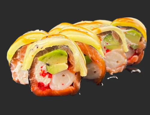 Холодный ролл. 8 штук Состав:нори,лосось,креветка,авокадо,сливочный сыр,тобика,киви,унаги.