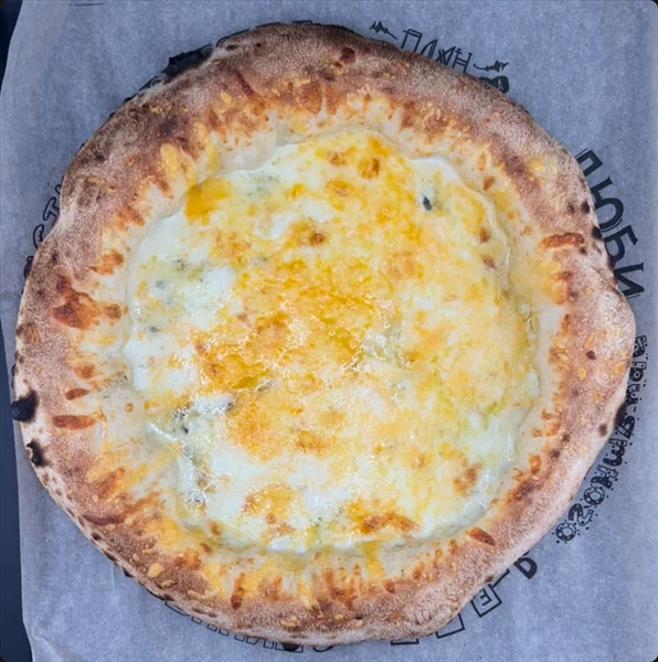 Пицца 28 см Состав: сыр моцарелла,сыр чеддер,сыр пармезан,сыр дор блю,сливочный соус.