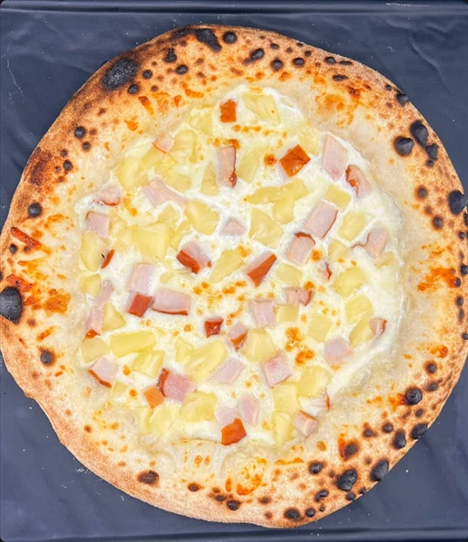 Пицца 28 см Состав : моцарелла,сливочный соус,копченная курочка,ананас.