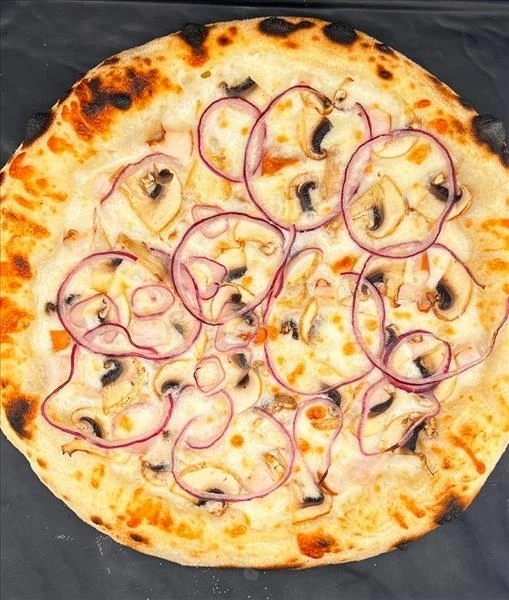 Пицца 28 см Состав: сливочный соус,моцарелла,грибы,лук.