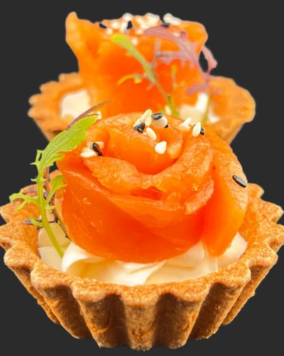 1 шт Состав: тарталетка,кремчиз,лосось,кунжут.