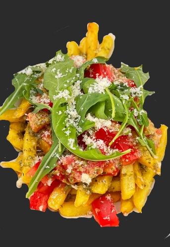 Состав: Картофель фри,соус песто,томаты,руккола,пармезан.