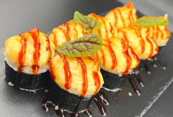 Запеченный ролл. 8 кусочков. Состав: рис,нори,сливочный сыр,снежный краб,лосось терьяки,огурец,сырная шапочка с пармезаном,унаги,кунжут.