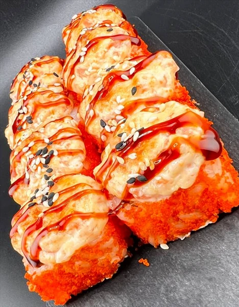 Запеченный ролл. 8 кусочков. Состав: рис,нори,сливочный сыр,свежий огурец,тобика,Креветочный замес(коктельная креветка,соус масага).