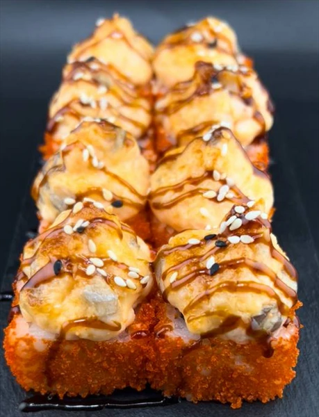 Запеченный ролл. 8 кусочков. Состав: рис,нори,сливочный сыр,свежий огурец,лосось,тобика,Креветочный замес(коктельная креветка,соус масага).
