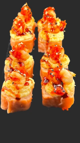 Запеченный ролл. 8 штук. Состав:рис,нори,сливочный сыр,огурец,креветка жаренная,лосось,сырный соус с пармезаном,тобико,кунжут,унаги.