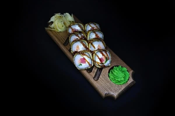 Жаренный ролл. Состав:рис,нори,сливочный сыр,зелёный лук,форель с/с,тунец,кляр,соус унаги,кунжут. * Добавьте к вашему заказу имбирь,васаби,соевый соус.(Эти позиции добавляються вами по желанию и идут за отдельную стоимость)