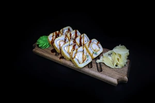 Жаренный ролл. Состав:рис,нори,сливочный сыр,снежный краб,креветка темпура,свежий огурец,кляр. * Добавьте к вашему заказу имбирь,васаби,соевый соус.(Эти позиции добавляються вами по желанию и идут за отдельную стоимость)