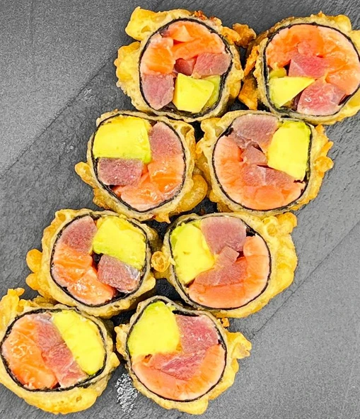 8 кусочков. Жаренный ролл. Состав:лосось,тунец,авокадо,кляр.