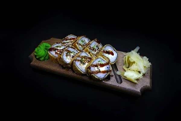 Жаренный ролл с угрем. Состав:рис,нори,сливочный сыр,угорь,свежий огурец,икра масаго,кляр,соус унаги,кунжут. * Добавьте к вашему заказу имбирь,васаби,соевый соус.(Эти позиции добавляються вами по желанию и идут за отдельную стоимость)